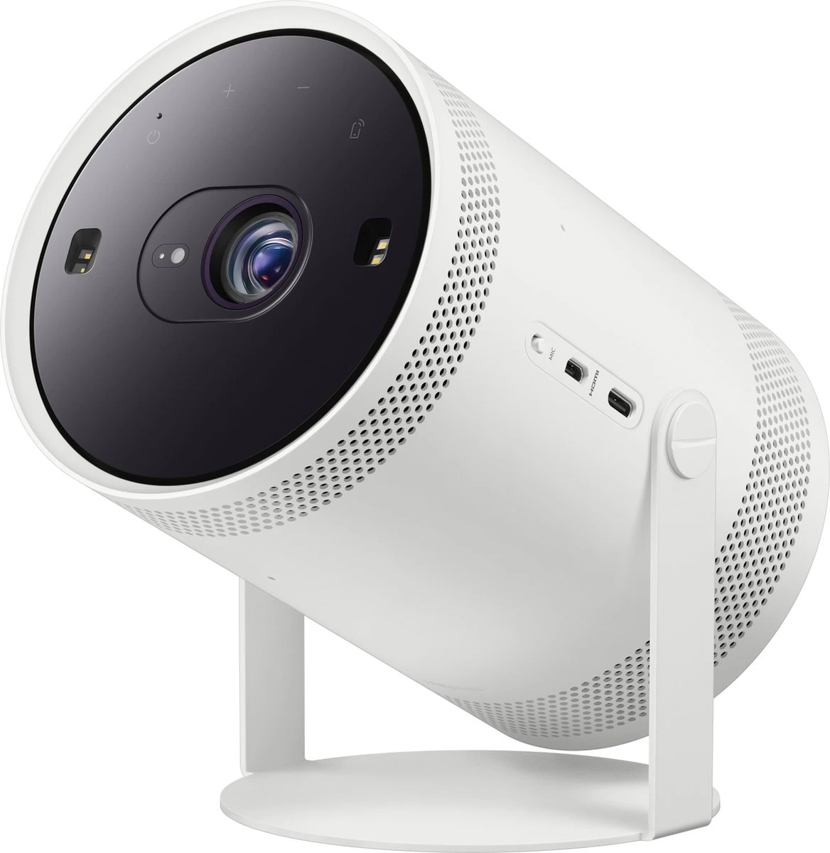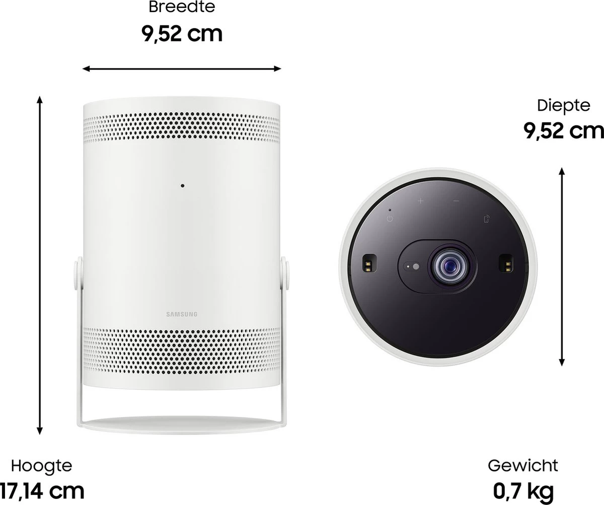 Samsung The Freestyle Projector LSP3B is een multifunctionele full hd beamer met een handig ontwerp voor onderweg. De beamer weegt slechts een kilo waardoor je hem gemakkelijk meeneemt naar vrienden. Hij projecteert een beeld van “30” tot “100”, waar je ook bent. Zet hem simpelweg neer, schakel hem in en je geniet binnen enkele minuten van een full hd projectie op de wand. Via de instant setup met Auto Keystone, Auto Focus en Auto Leveling geniet je razendsnel van scherp en horizontaal beeld. Liever projecteren op het plafond? Geen probleem, want je kantelt de projector gemakkelijk tot 180 graden. Kies je favoriete content op het Tizen smart platform. Hier vind je apps zoals Netflix, YouTube en Videoland. Dankzij de ingebouwde 360 graden speakers luister je zonder externe apparaten ook naar het geluid van de film. Als de film is afgelopen, gebruik je The Freestyle als lamp of projecteer je je eigen foto’s in de Ambient Mode. Zorg er wel voor dat de ruimte altijd volledig verduisterd is, want vanwege de lage lichtopbrengst van 230 lumen is deze beamer niet geschikt voor verlichte ruimtes.