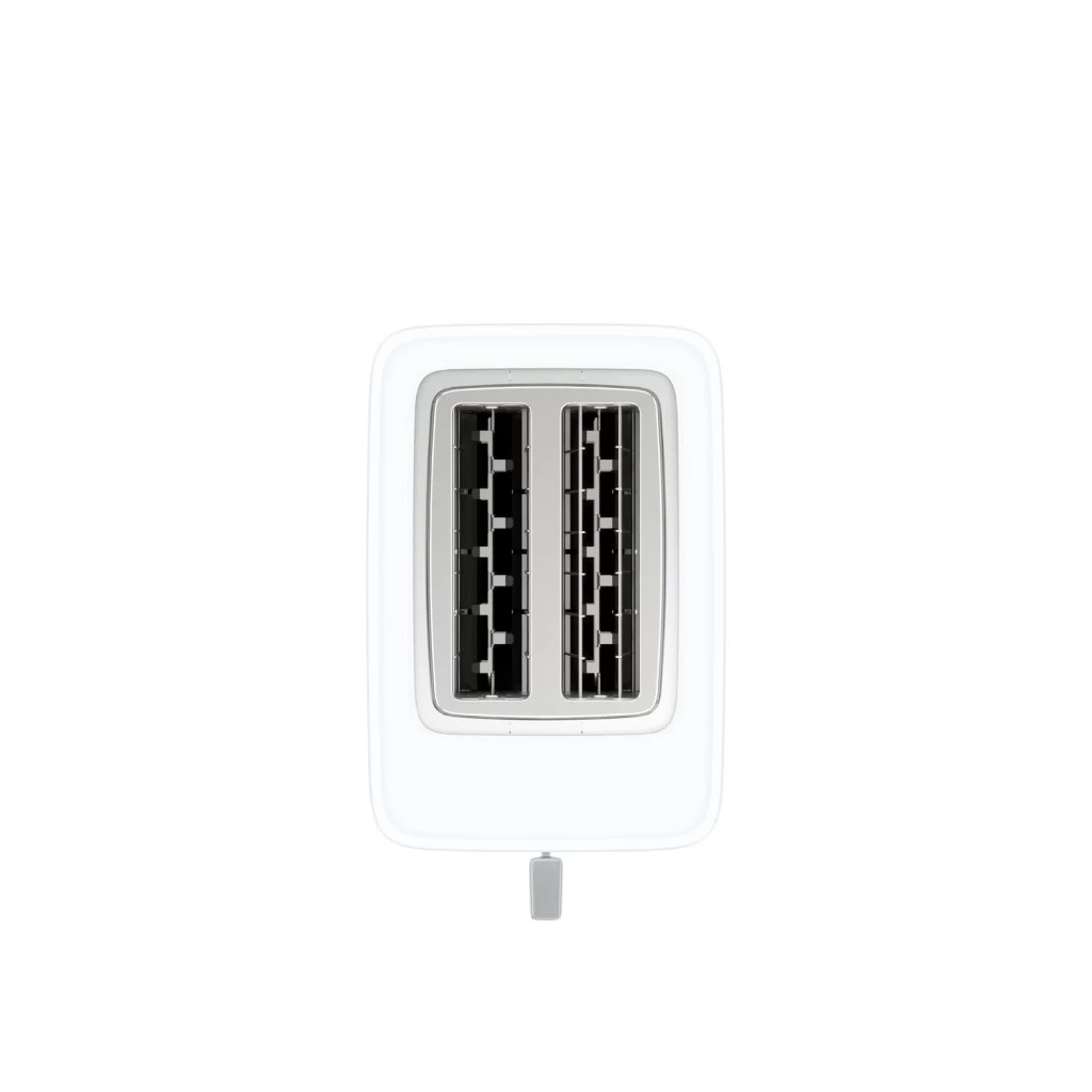 - Deze moderne, witte broodrooster met twee sleuven laat je je voorkeursinstellingen opslaan, zodat ze met één druk op de knop te activeren zijn